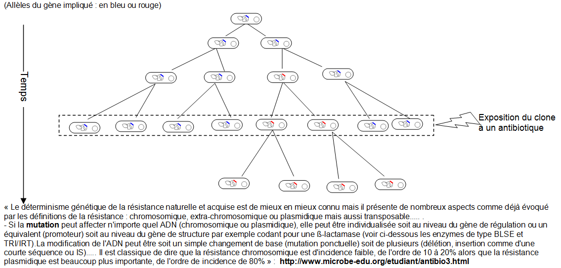 Savoir : Des mutations spontanées provoquent une variation génétique dans les populations de bactéries. Parmi ces variations, certaines font apparaître des résistances aux antibiotiques. L’application d’un antibiotique sur une population bactérienne sélectionne les formes résistantes et permet leur développement. L’utilisation systématique de traitements antibiotiques peut augmenter la fréquence des formes résistantes par sélection naturelle.